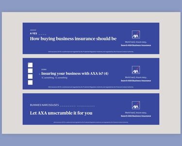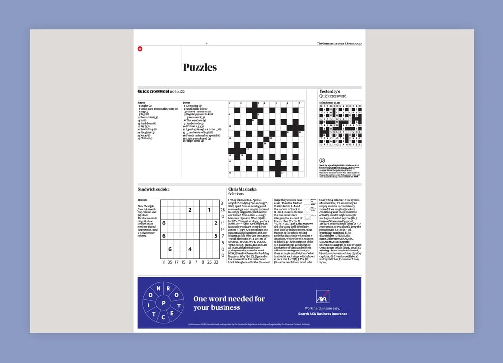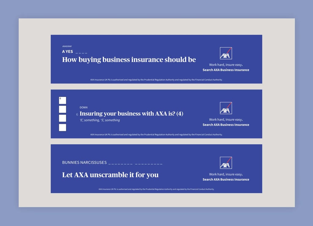 The AXA Business Insurance puzzle campaign, designed to raise brand awareness for AXA’s “Work hard, insure easy” proposition, was a six-month rotating activation placed strategically within The Guardian’s puzzles supplement.
