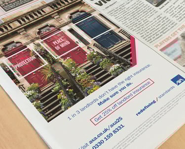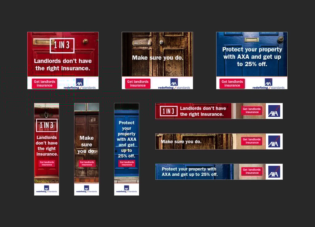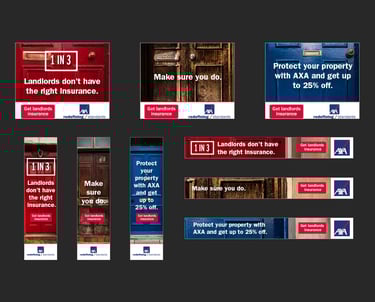 AXA's research highlighted that at the time 35% of landlords were underinsured, therefore putting their investments at risk. To address the campaign's objective to increase quotes and sales while boosting brand awareness, I supported the development of an ABL campaign from a creative perspective. The creative was centred around the message, "1 in 3 landlords don’t have the right insurance. Make sure you do," which directly supported the objective by emphasising the urgency of proper coverage. Coupled with a 25% discount on AXA Landlord Insurance, the campaign encouraged landlords to secure their properties, aligning with the goal of increasing both sales and brand recognition.